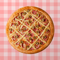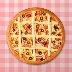 Mussarela, presunto, azeitonas pretas, tiras de cebola e cream cheese.